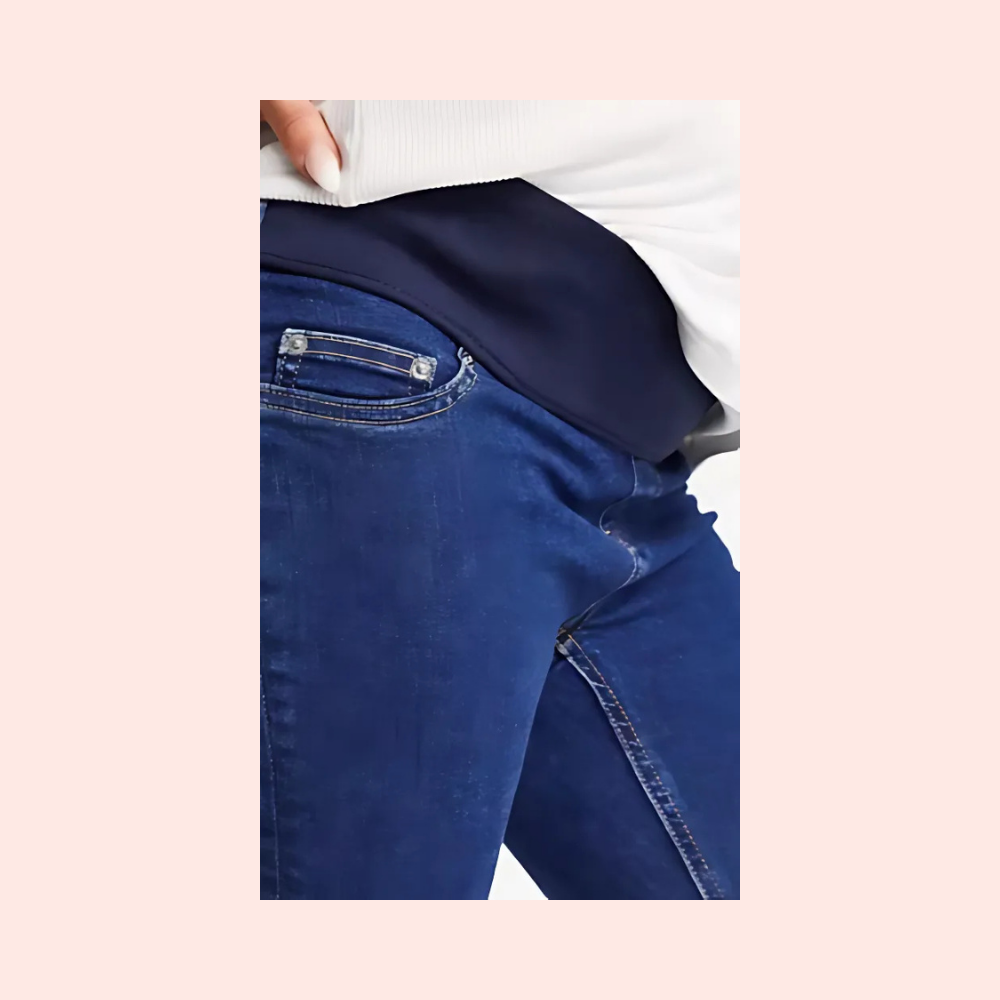 Jeans de grossesse skinny coupe ajustée, bande sous le ventre en coton stretch, taille normale.