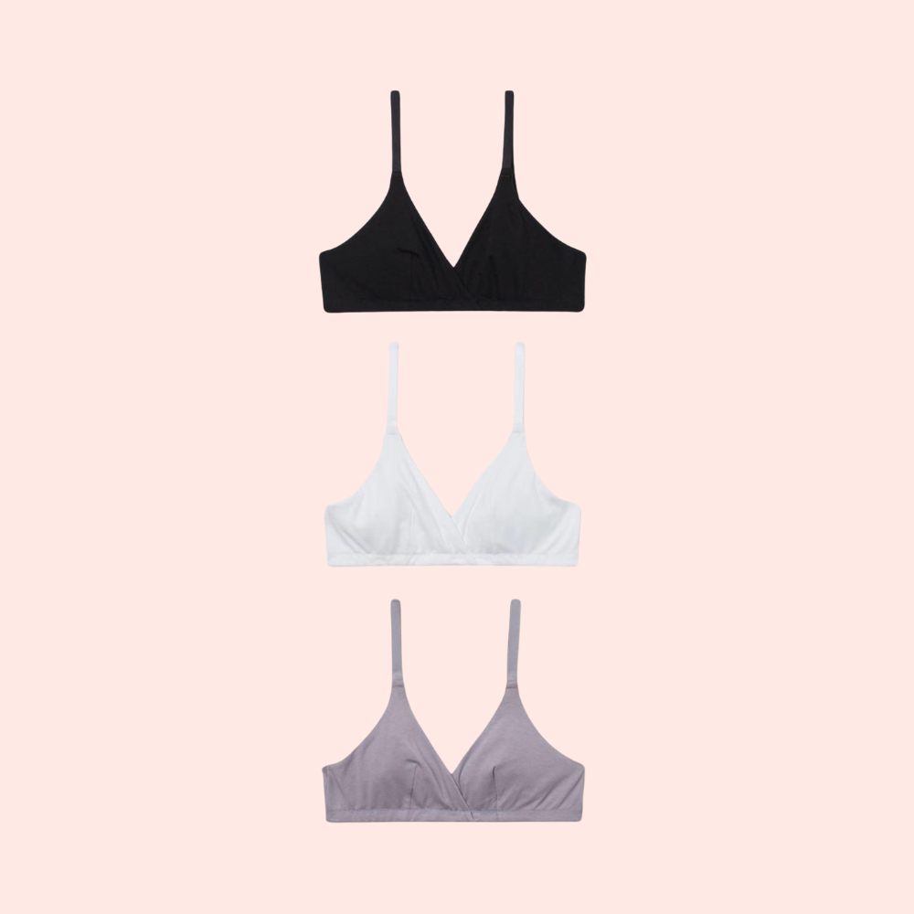 Soutiens-gorge d’allaitement à bonnets souples en coton doux. Bretelles réglables, bonnets doublés avec inserts amovibles et ouverture avec espace pour les coussinets d’allaitement, et fermetures à crochets à l’arrière.